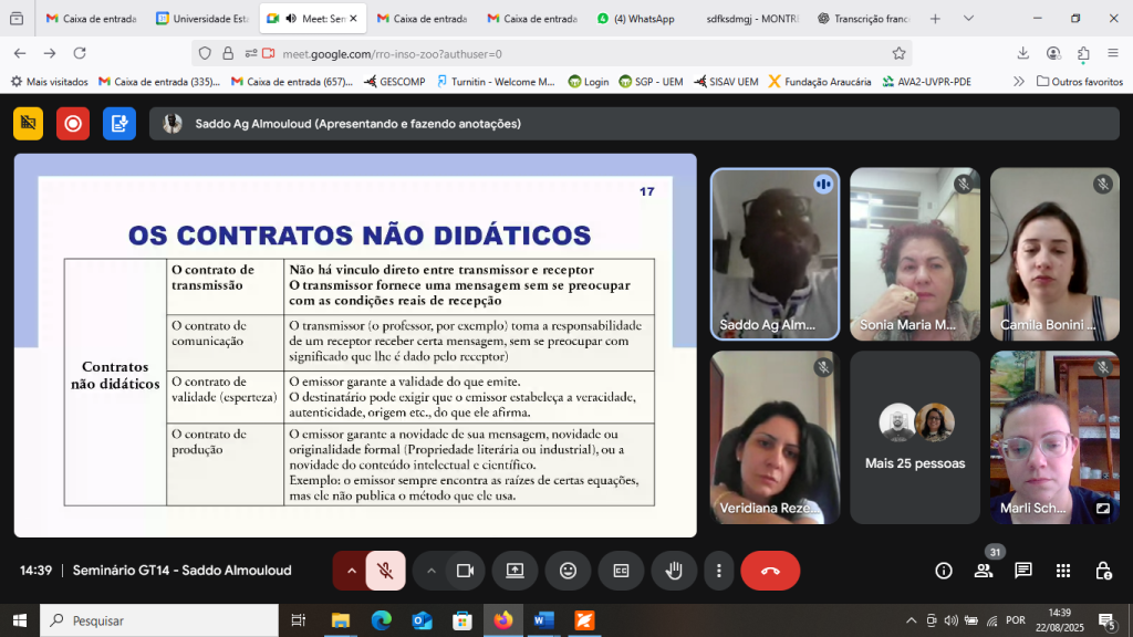 Durante a apresentação, Almouloud explorou a dinâmica dos contratos didáticos, sugerindo que a repartição de responsabilidades entre professores e alunos é fundamental para o aprendizado. Ele categorizou os contratos em didáticos e não didáticos, discutindo suas características e a necessidade de adaptar os métodos de ensino às situações específicas dos alunos. O professor também abordou a complexidade dos contratos de transmissão e comunicação, enfatizando a importância da regulação no processo educativo e criticando a ideia de que um único método didático pode resolver todos os desafios da aprendizagem. A discussão foi enriquecida pela participação ativa dos colegas, promovendo um ambiente colaborativo e reflexivo.