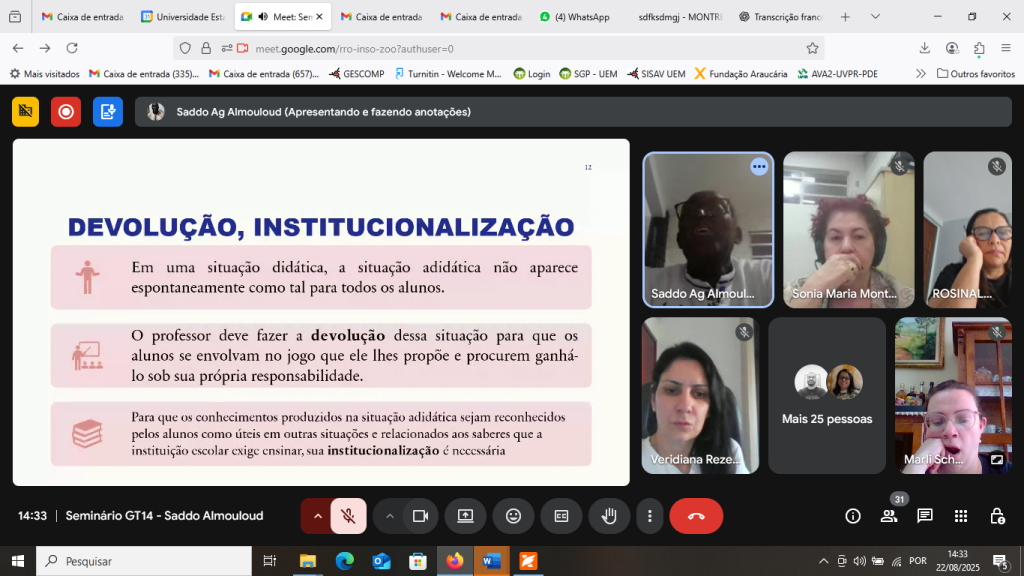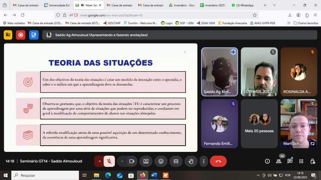 O seminário abordou a importância da teoria das situações na didática da matemática, com a participação de Saddo Almouloud, que destacou a relevância das interações entre alunos, professores e o conhecimento. Almouloud enfatizou que a aprendizagem significativa depende de situações didáticas adequadas e que a eficácia dessas situações é influenciada por fatores externos, como o contexto psicosociocultural. Ele também discutiu a distinção entre conhecimento e saber, ressaltando a importância das situações de ação, formulação e validação no processo educativo, além do papel do professor em incentivar a responsabilidade dos alunos pelo seu aprendizado.